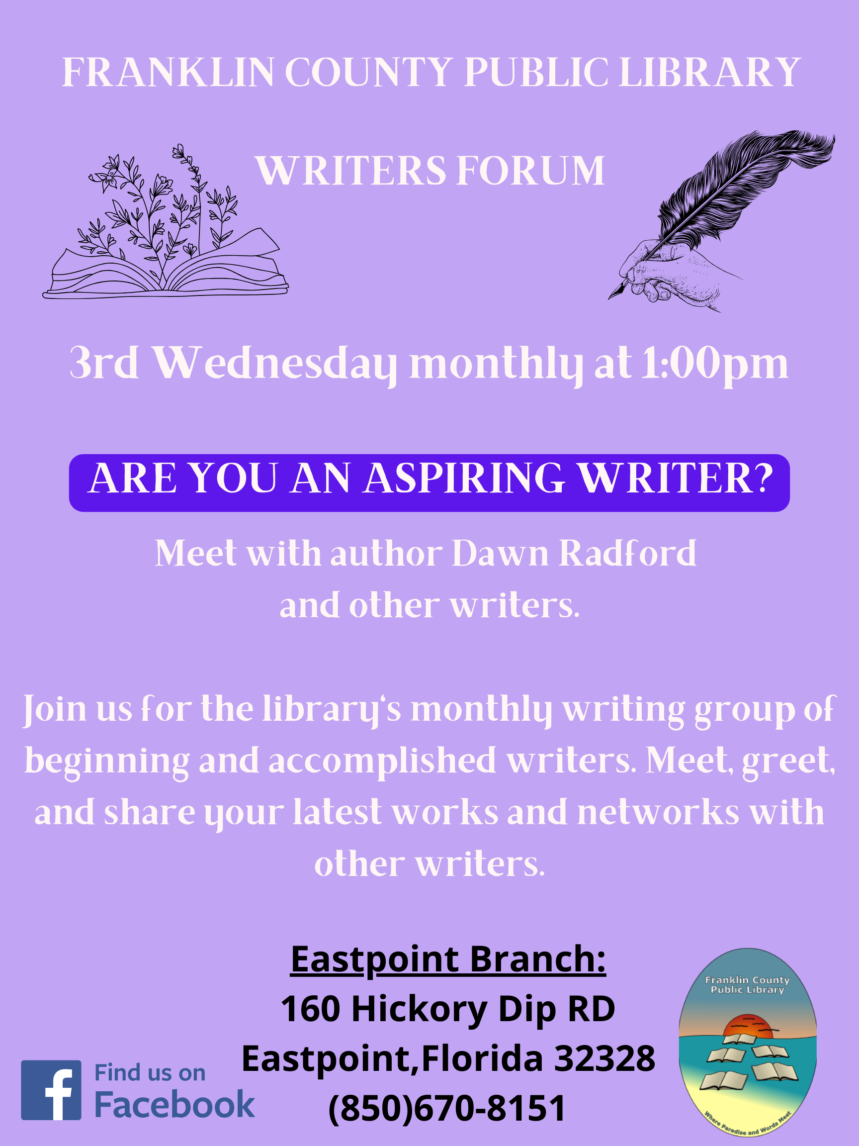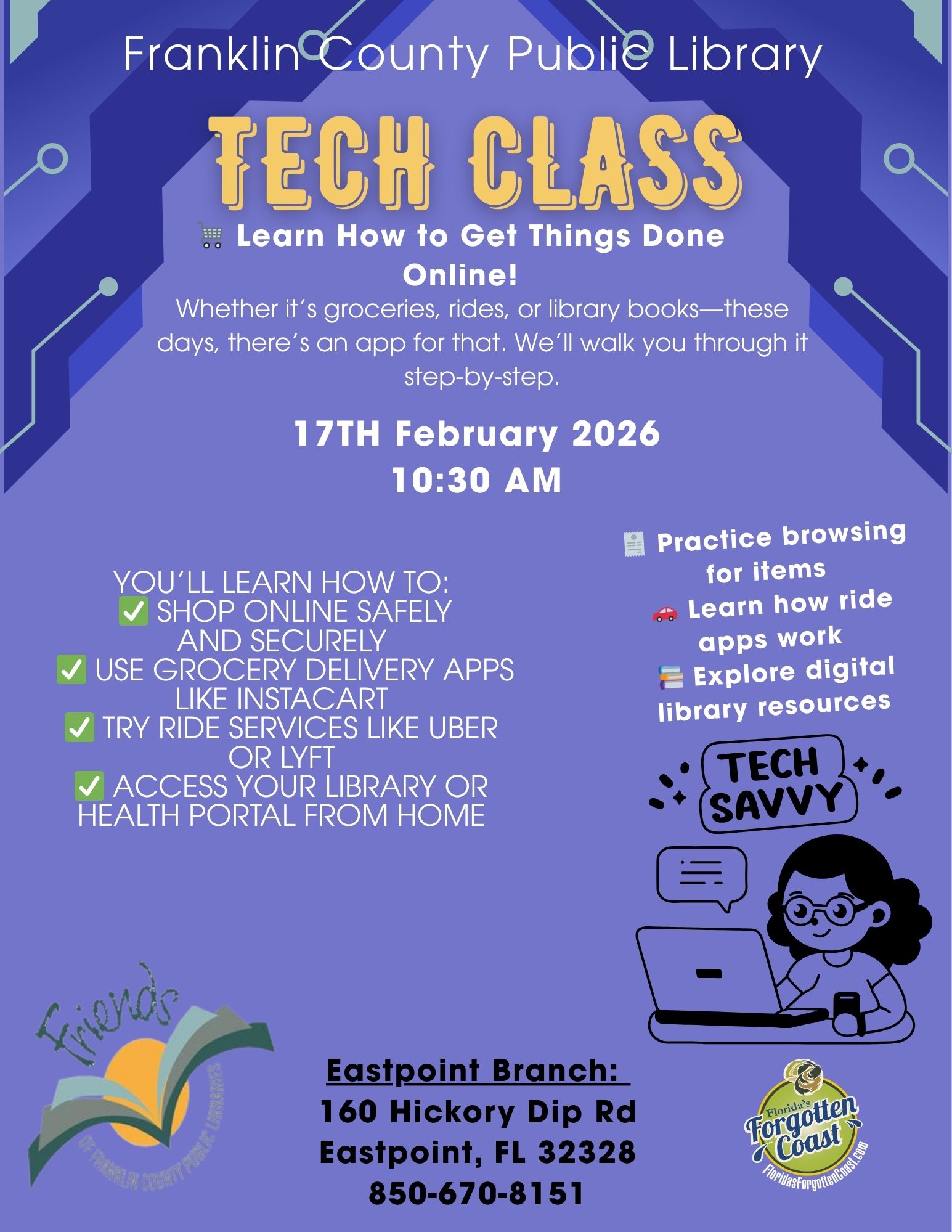 For more information, contact the Eastpoint Branch at 160 Hickory Dip Rd, 850-670-8151 or the Carrabelle Branch at 311 St, James Ave (Hwy 98), 850-275-9895. Funded in part by the Franklin County Tourist Development Council.