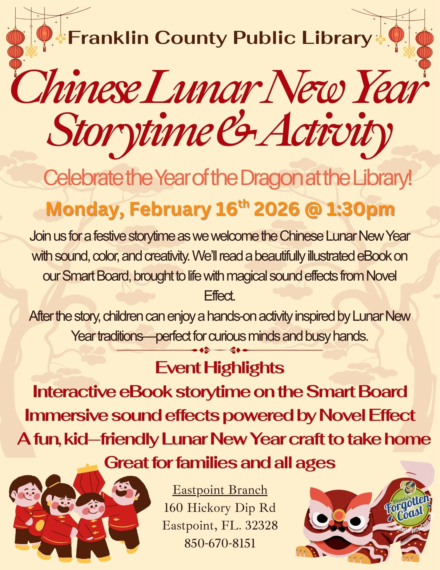 Great for families and all ages. Celebrate the Year of the Dragon at the Library! Join us for a festive storytime as we welcome the Chinese Lunar New Year with sound, color, and creativity. We’ll read a beautifully illustrated eBook on our Smart Board, brought to life with magical sound effects from Novel Effect.After the story, children can enjoy a hands‑on activity inspired by Lunar New Year traditions—perfect for curious minds and busy hands. Event Highlights: Interactive eBook storytime on the Smart Board; Immersive sound effects powered by Novel Effect; A fun, kid‑friendly Lunar New Year craft to take home.