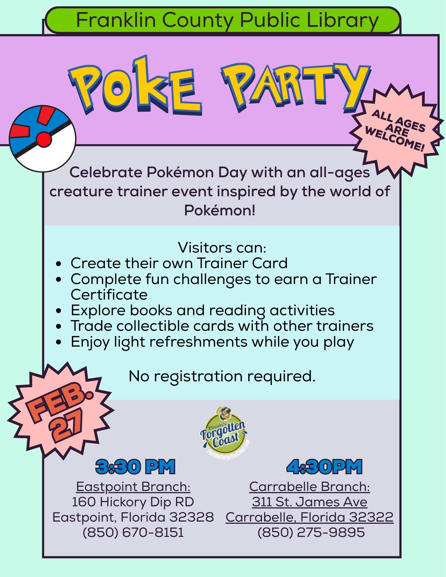 Pokémon Party - Friday, February 27 at 3:30 pm at the Eastpoint Branch & at 4:30pm at the Carrabelle Branch